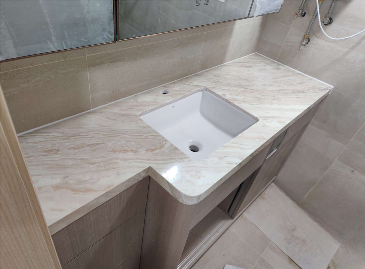 石英石的用途也非常廣泛,不只適合廚房檯面,也適合吧枱面、浴室檯面、浴室牆面、窗台面、地板甚至 feature wall。近年更流行使用 7mm 超薄石英石作為櫃門、牆身或家具面板,重量更輕、施工更靈活,視覺效果也更現代。